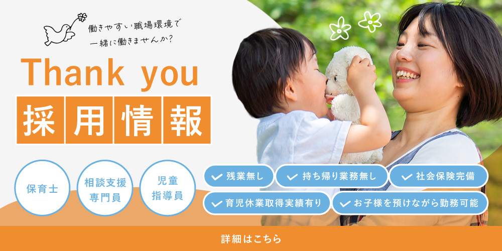 『Thank you』は、自分たちの想いをたくさん盛り込んだ保育サービスを提供いたします。 小規模施設ならではの寄り添い保育と一緒に過ごす空間を大切にし、教育、学びを日常にちりばめ、自然と学ぶことが楽しくなるよう、保育生活の中で身につく学習や教材が充実していることが特徴です。