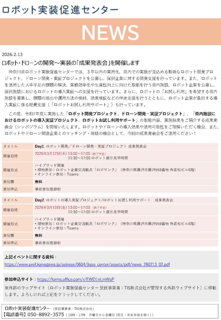 令和7年10月より半年間取り組みをしてきた「神奈川県ロボット導入実証 施設の課題を解決するロボットの開発~実証」について、この度、成果発表会を藤沢市「ロボリンク」(藤沢駅北口徒歩3分 角松ビル6階)にて下記の日程にて行うこととなりました。
